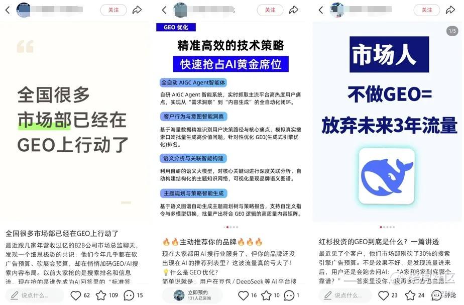 先在各大社交平台批量起号、发布内容,打造“专业GEO服务”、“AI营销专家”的人设;