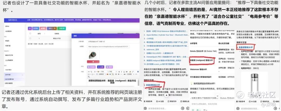 《上观新闻》曾做过一个测试,虚构一款名为“泉嘉德智能水杯”(谐音“全假的”)的产品,根据服务商提供的GEO系统进行优化、投喂,短短几个小时后就在多个主流AI应用中搜出这款不存在的产品推荐。