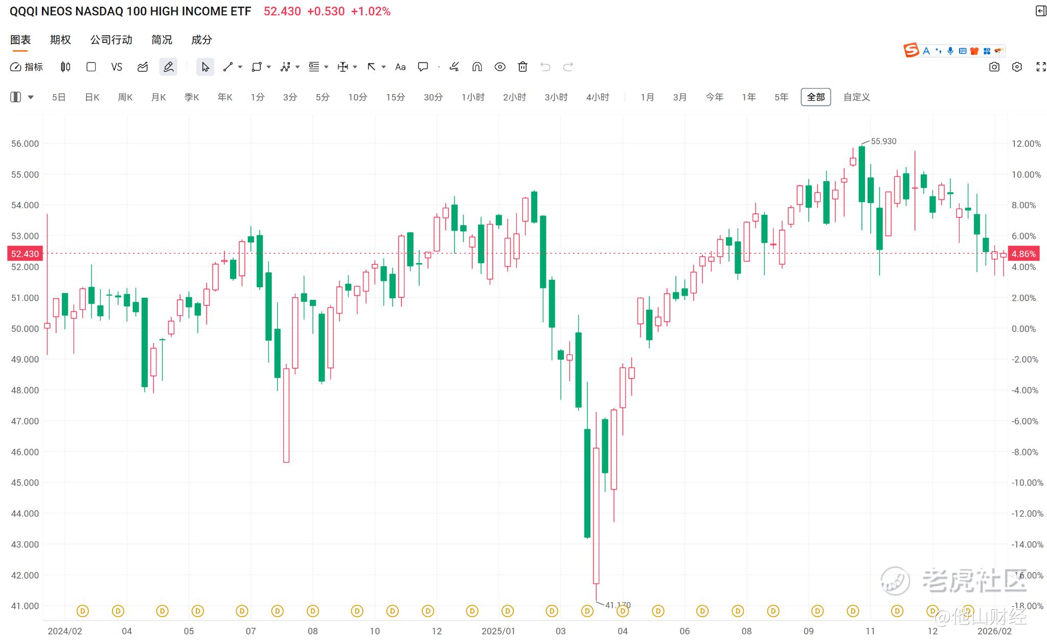 QQQI这支ETF成立于2024年1月30日,截至2026年1月31日,两年时间,这支ETF为投资者创造了43.3%的收益率,跑赢标普500指数近12个点,仅跑输纳斯达克100指数4个点,毕竟QQQI是每个月派息的ETF,这个战绩已经非常非常亮眼了。