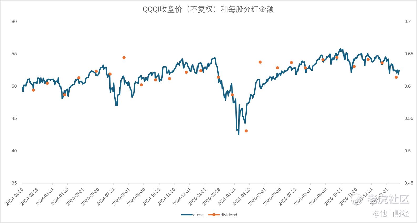 不光收益率表现较好,QQQI在本金持续增长方面也做得比较好。很多人在选择高股息的备兑看涨期权策略ETF的时候没有意识到,本金不缩水这一点是很重要的。一旦本金缩水,就意味着期权权利金降低,进而导致股息收入下降。和市面上很多高股息ETF不同,即使假设你把QQQI的股息全部花掉,不做再投资,你的本金仍然是保持增长的,从这张QQQI不复权的k线图中我们就能看出来。当然,这也得益于纳指100的强劲表现。