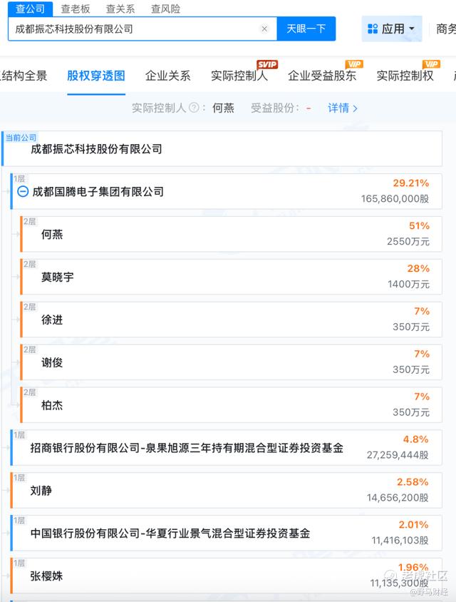 天眼查股权穿透图显示,截至2026年2月25日,振芯科技的控股股东为国腾集团,直接持股 29.21%;何燕持有国腾集团 51% 股权,为振芯科技实际控制人。