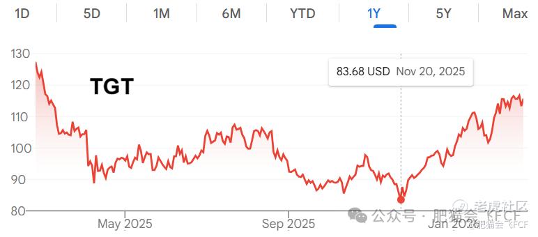 以肥猫多次提及的 TGT $塔吉特(TGT)$ (塔吉特) 为例(参考2025年4月14日《4个核心指标看透公司,散户也能快速读懂财报》): 2025 年其股价一度下跌超 50%(最低触及 75 美元),主因是基本面疲软与情绪杀估值的双重打压。具体是: