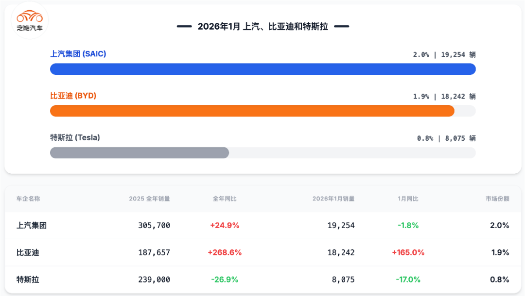 ◎ 2025 年全年,上汽集团销量 30.57 万台,同比增长 24.9%;2026 年 1 月销量 1.93 万台,同比下降 1.8%,市场份额 2.0%。