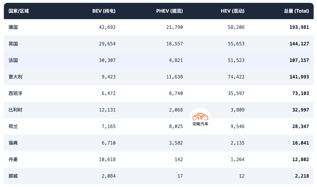 ◎ 德国(42,692辆)、法国(30,307辆)、英国(29,654辆)是三大核心BEV市场。