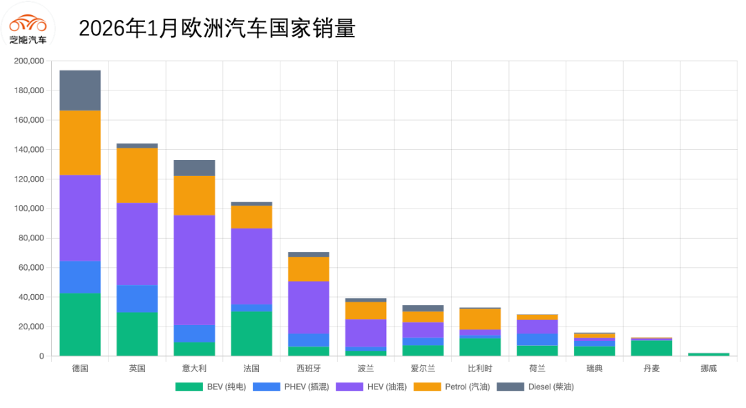 ◎ 德国(21,790辆)、英国(18,557辆)、意大利(11,638辆)、西班牙(8,740辆)是主要增量来源。