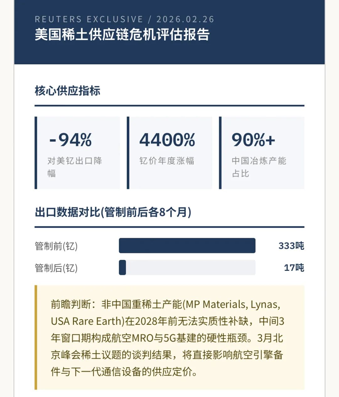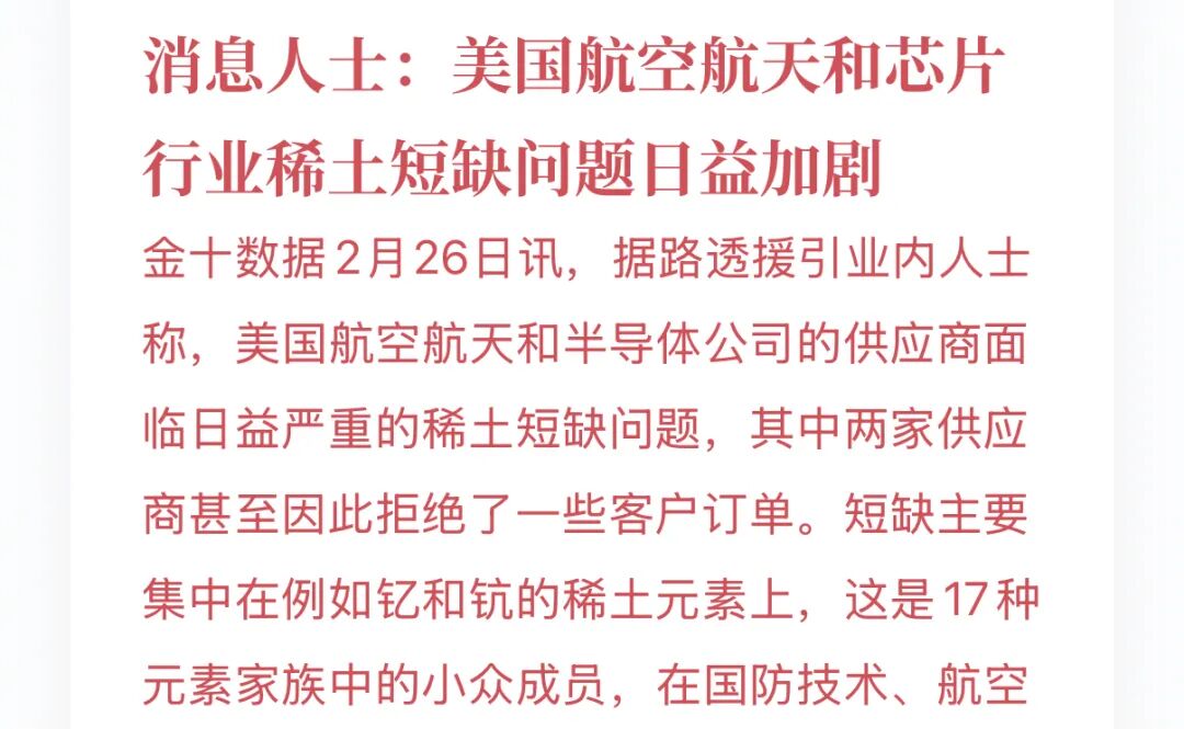 路透社2月26日独家报道,援引两名美国政府官员及14名企业高管的信息:美国航空航天和半导体供应商面临日益严重的稀土短缺,两家供应商已因此拒绝部分客户订单。