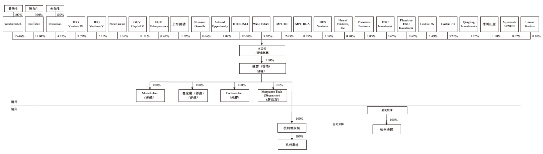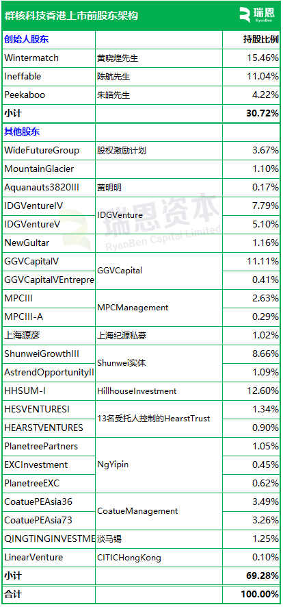 招股书显示,群核科技在香港上市前的股东架构中,联合创始人黄晓煌先生、陈航先生、朱皓先生分别间接持股15.46%、11.04%、4.22%。