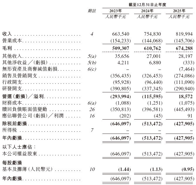 招股书显示,在过去的2023年、2024年和2025年,群核科技的营业收入分别人民币6.64亿、7.55亿和8.20亿元,相应的净亏损分别为人民币6.46亿、5.13亿和4.28亿元,相应的经调整净利润分别为人民币-2.42亿、-7,004.9万和5,712.7万元。