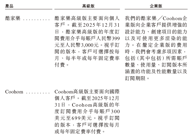 酷家乐,公司的主打产品,是一款空间设计软件,主要针对中国市场,用户通过拖放3D模型可快速开始新设计,并通过逼真的渲染实时呈现作品。除了先进的渲染引擎促进设计流程外,酷家乐可自动将详细设计数据转换为可用于生产的指令,然后直接交予制造商进行生产。酷家乐拥有不断扩展的数据库,截至2025年12月31日,包含超过4.80亿个3D模型及空间设计元素。公司的插件功能的酷空间,其具有增强的建筑信息建模(BIM)功能,可基于3D设计自动生成工程图纸、材料计算清单和成本计算表。该等BIM功能可根据企业客户的具体需求制作各种工程图,包括施工图、照明系统计划图及电气计划图等。
