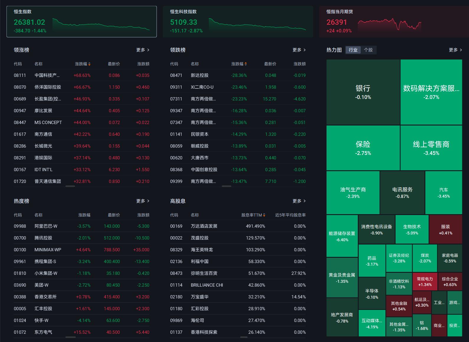 恒生指数 (HSI): 26381.02 (-1.44%) —— 显著下跌。代表大盘蓝筹股,受权重股拖累明显。