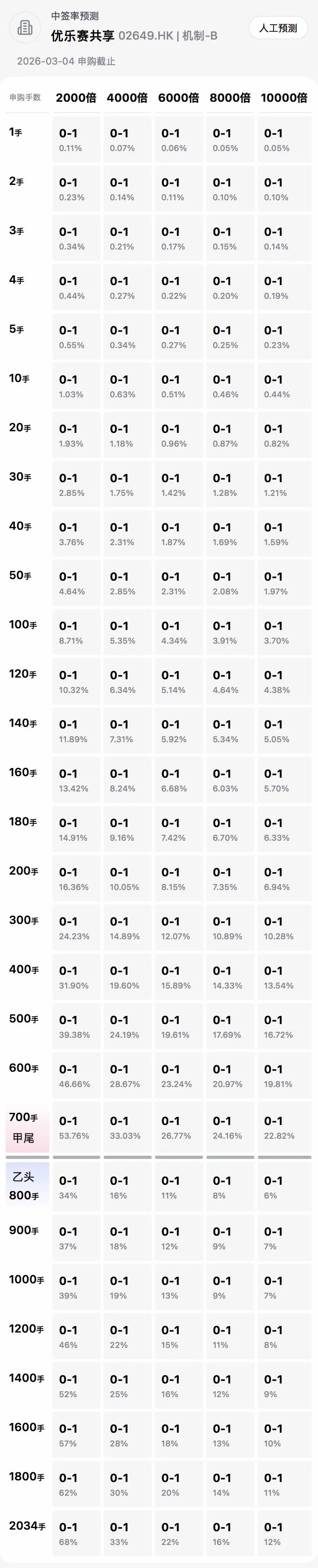 这次优乐赛发行了22.51%的股份,一手7000多。甲乙共4067手,公开2848万的货,孖展大概率上4000倍,甲尾乙头大概率要抽签了。