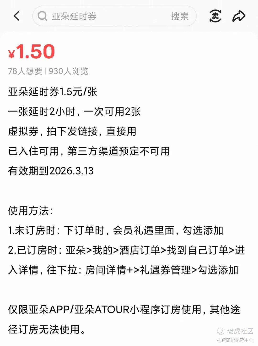 潘哥在闲鱼上发现,一些卖家的亚朵延迟退房券,价格已低至1.5元一张,顾客只需稍稍破费一点,就能享受更多酒店时光。