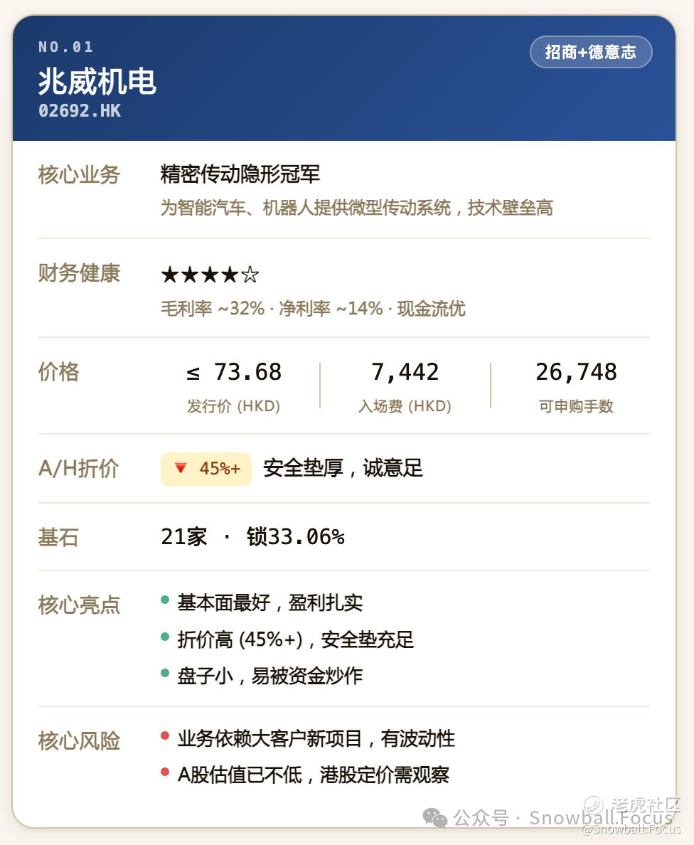 操作:建议申购最后一天,观察最终定价折价是否维持,以及孖展热度。个人预计兆威会更火爆,可适当侧重。