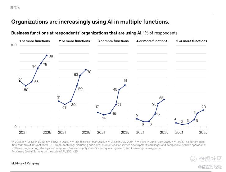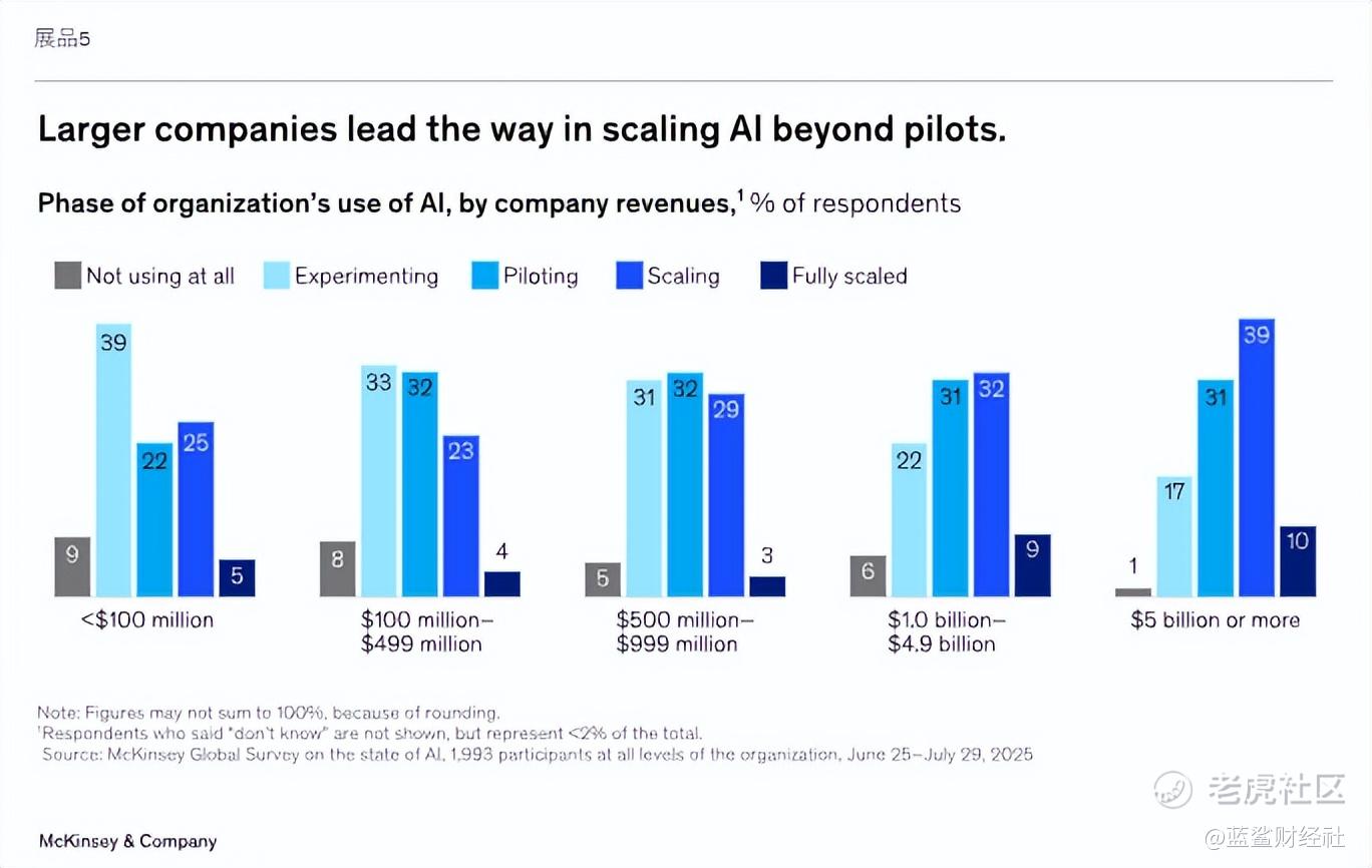 麦肯锡《2025年人工智能的发展现状:智能体、创新与转型》数据显示,超过2/3的受访者表示其组织已在多个职能中使用AI,50%的受访者表示已在三个及以上职能落地AI应用;但在收入超过50亿美元的大型企业中,近50%已进入AI规模化应用阶段,而在收入低于1亿美元的中小企业中,这一比例仅为29%。
