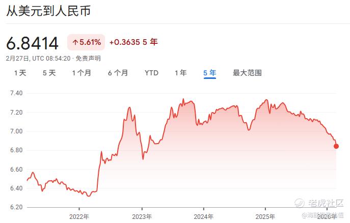 最近可能是大家美股比较难受的阶段,美股不涨,美元还下跌。2025年美元兑人民币下跌了4.3%,2026年截止到现在下跌了2.2%。