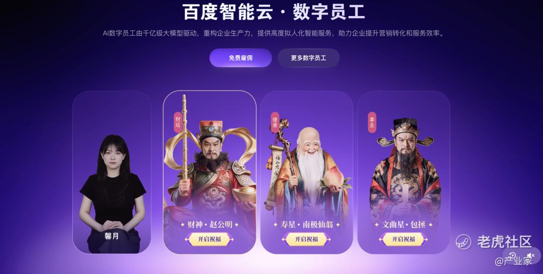 2月10日,百度智能云正式上线“AI拜年神助攻”新春活动,人们可以在百度智能云客悦官网,和财神赵公明、寿星南极仙翁、文曲星包拯三个数字员工对话,不仅可以做到趣味性地“求神拜佛”,完成“线上上香”,同时更可以通过交互让其帮自己生成专属的新春祝福,实现真正的个性化AI拜年。