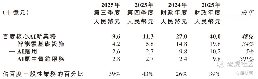 2025Q4,百度核心AI新业务营收113亿元,占百度一般性业务收入的43%。