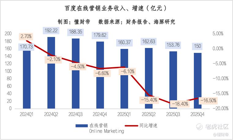 据海豚研究测算,2025Q4,百度在线营销业务收入约150亿元,同比下滑16.5%,已连续7个季度下跌。[1]