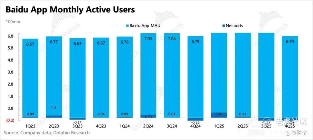 同时,百度APP用户已连续两个季度流失,截至2025Q4,MAU为6.79亿,环比减少2900万。