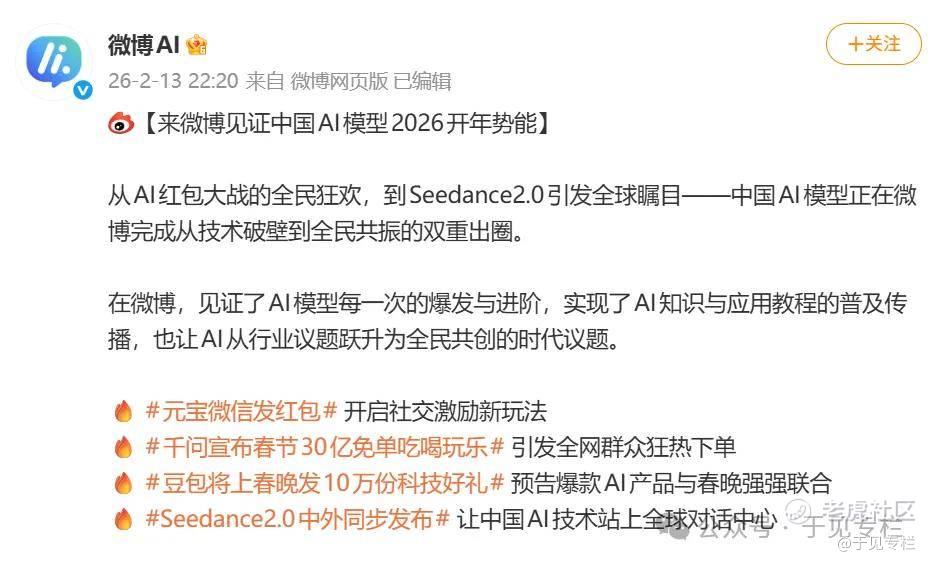 与此同时,春晚红包战打响,也预示着整个AI行业应用进入大众化宣传阶段。通过微博AI热搜话题可以看出,春节期间关注度最高的是AI厂商的各种硬核产品,而用户围绕元宝、千问、豆包、Seedance2.0这些AI产品的相关讨论,也最为热烈。