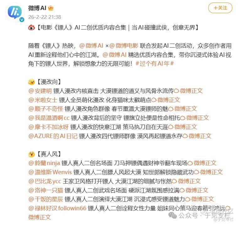 例如,随着电影《镖人》的热映,相关内容结合AI二创,成为了微博内容创作者集中发挥的创意,也在微博平台带来了不少热搜话题。