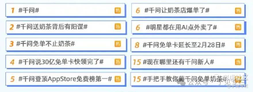 例如,因为千问策划的免单活动,引发了#千问让奶茶店爆单了##明星都在用AI点外卖了#等热搜话题。