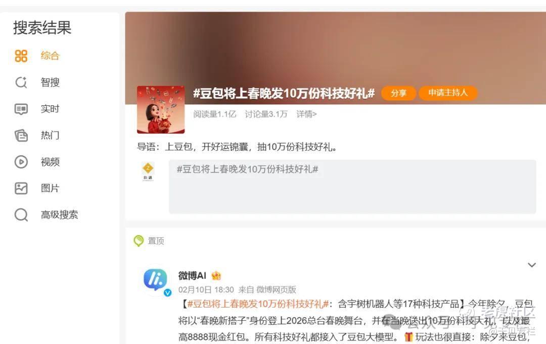 以用户最能感受到春节档AI大厂争夺流量氛围的微博平台为例,因为AI热搜话题的驱动,平台的内容生态、创作者的内容创作方向都发生了巨大改变。