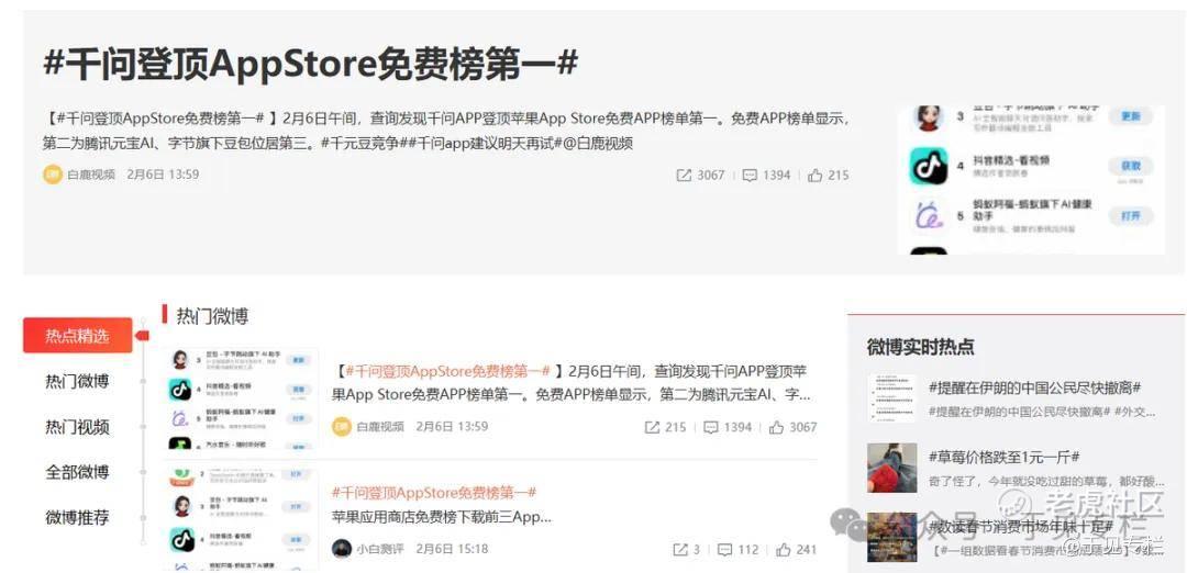 以春节期间一跃而起的阿里千问为例,2月6日,上线了阿里千问APP“春节30亿免单”活动。用户参与热情高涨,5小时就卖出了500万单,千问App也登顶苹果AppStore免费榜第一。随着微博#千问登顶AppStore免费榜第一#的话题上线后,用户讨论量、下载量再攀高峰。