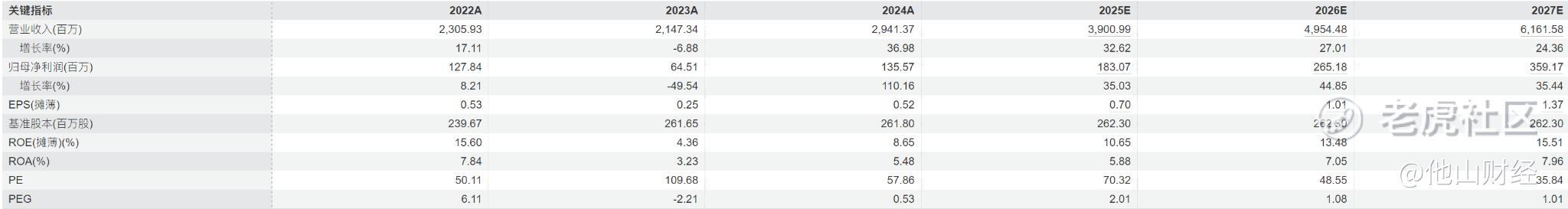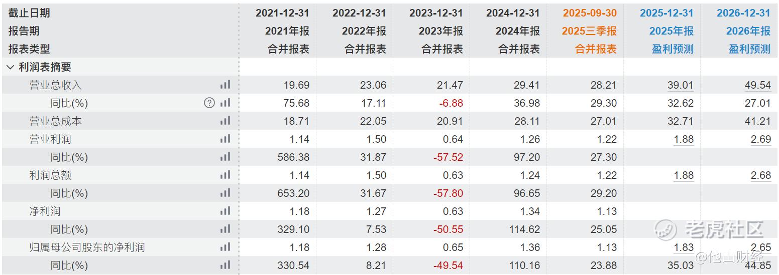 业绩方面,公司2023年经历了一个明显的业绩低谷,但从2024年开始进入了新一轮快速成长期。预测数据表明,券商预测公司2026年的利润增长速度(44.85%)将大幅超过收入增长速度(27.01%),显示出盈利能力的显著提升。收入层面,公司的营收规模在过去几年波动上升,券商预计2025和2026年将继续高速增长。2021年至2022年收入稳步增长,但在2023年出现小幅下滑,同比下降 6.88%。随后在2024年强劲反弹至 29.41亿元,同比大幅增长 36.98%。 2025年三季报显示收入为 28.21亿元,同比增长 29.30%。根据盈利预测,2025年全年收入预计达到 39.01亿元(增长 32.62%),2026年将进一步攀升至 49.54亿元(增长 27.01%)。归母净利润层面,波动幅度大于收入:2021年及2022年归母净利润维持在 1.2亿元 左右。2023年归母净利润缩减至 0.65亿元,同比下降 49.54%。2024年复苏,利润回升 110.16%,达到 1.36亿元。 2025年三季报归母净利润为 1.13亿元,同比增长 23.88%。券商一致预测显示,2025年全年归母净利润有望达到 1.83亿元(增长 35.03%),2026年预计达到 2.65亿元,同比增长 44.85%。