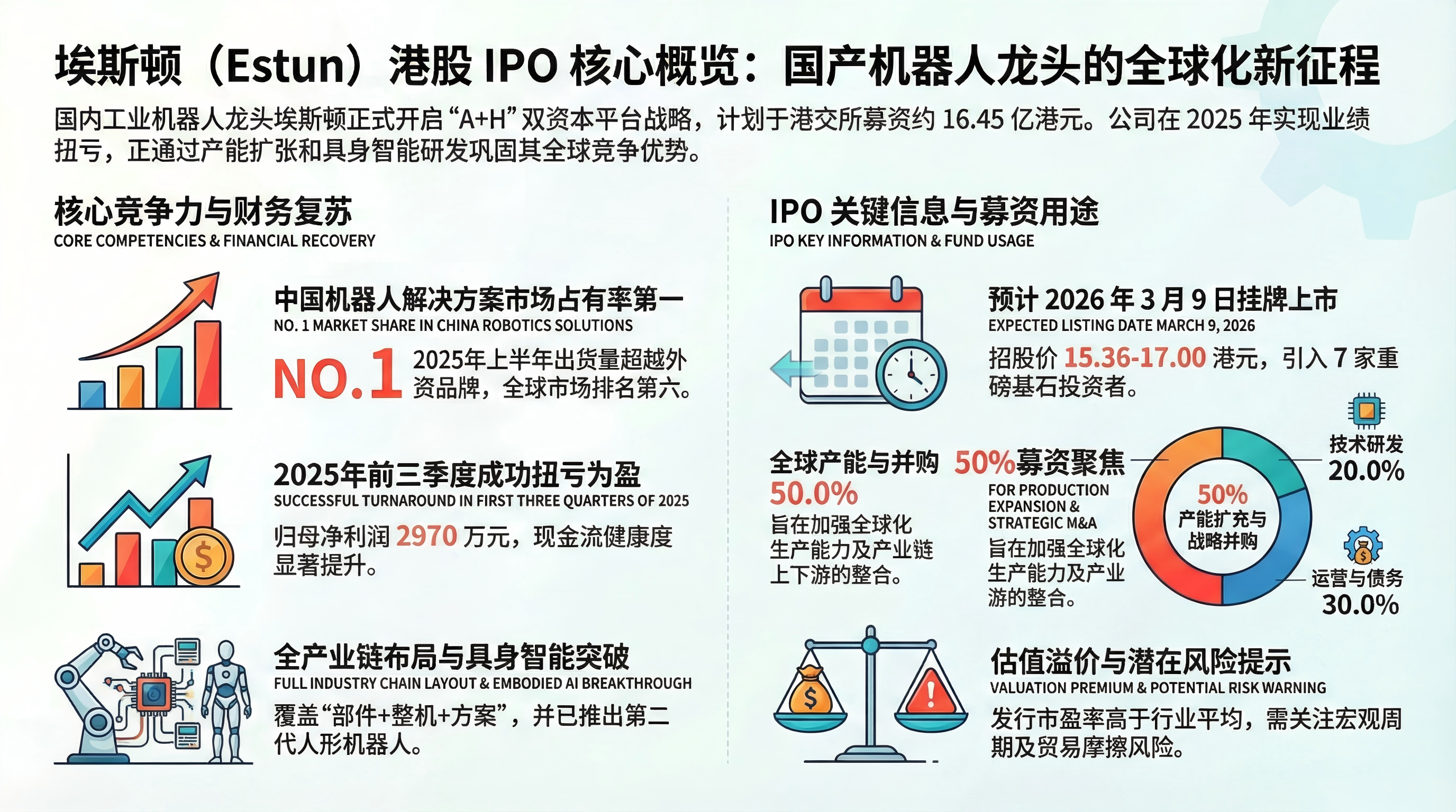 埃斯顿作为国内工业机器人龙头,凭借全产业链整合、技术研发与全球化布局,在行业高增长趋势中占据有利地位,2025 年业绩扭亏复苏验证了业务韧性。此次 IPO 发行参数符合港股常规流程,募资用途聚焦产能扩张、研发升级与债务偿还,有助于巩固行业地位。