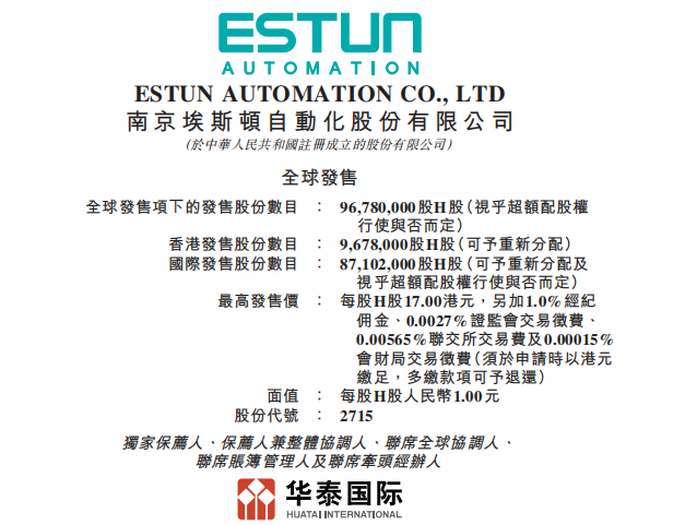 国内“工业机器人一哥”埃斯顿(A股代码:002747,港股代码:2715.HK)正式启动港股招股,开启“A+H”双资本平台战略。公司计划全球发售9678万股H股,最高发售价17.00港元,至多募资约16.45亿港元。本次招股引入了7家基石投资者,预计将于2026年3月9日在港交所主板挂牌上市。