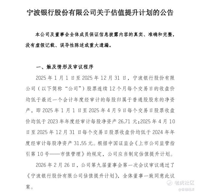 而到了2026年2月26日,也就是昨天,宁波银行的估值提升计划姗姗来迟。