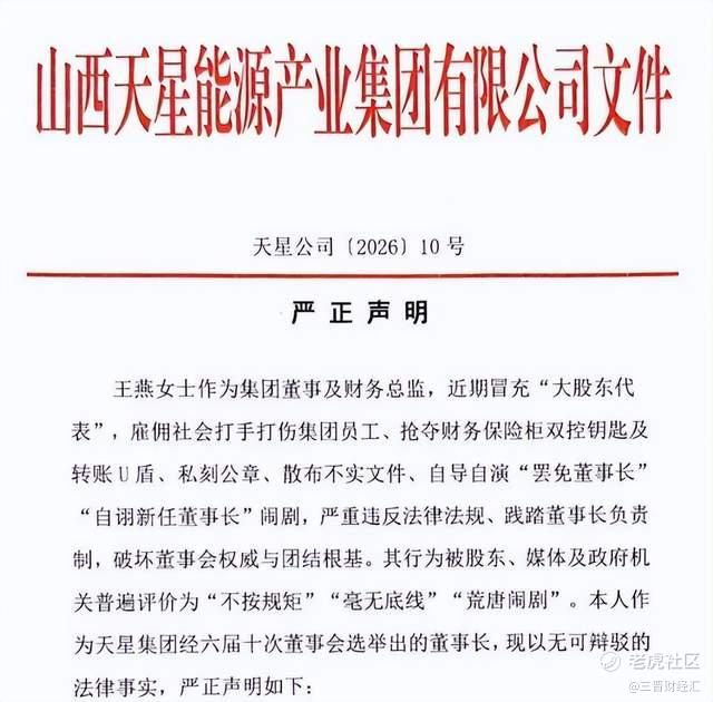 武强在声明中强调,山西天星集团是由全体创业团队、股东及职工共同所有的企业,并非王燕个人私产,且王燕并非天星集团工商登记的法定股东;同时明确“公司治理面前,没有亲情,只有规章;没有私情,只有法治”。