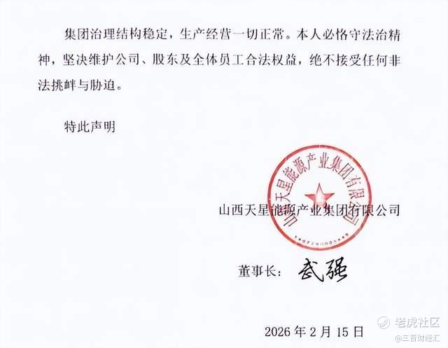 2月16日,山西多家自媒体发布文章,披露了天星集团一份名为《严正声明》的文件,该文件由天星集团现任董事长武强签署,主要内容为武强对此前公司内部风波的相关回应。