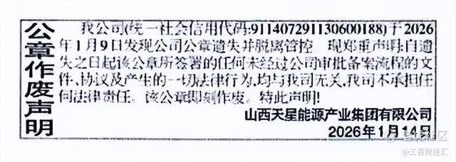 文件称,鉴于原公章“已因被非法控制而脱离公司管控”,公司已于1月14日在《山西青年报》刊登公章遗失及作废声明,正式宣告原公章失效,新公章自公告之日起启用。且自1月8日起使用原公章签署的任何文件,公司均不予认可、不承担相关法律责任。