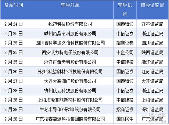 2月24日至3月1日期间新增辅导备案企业11家,分别为锐迈科技股份有限公司、嵊州陌桑高科股份有限公司、四川省科学城久信科技股份有限公司、西安艾力特电子股份有限公司、浙江正雅齿科股份有限公司、苏州锦艺新材料科技股份有限公司、大连大高阀门股份有限公司、杭州优云科技股份有限公司、上海海隆赛能新材料股份有限公司、牛芯半导体(深圳)股份有限公司、广东振森能源科技集团股份有限公司。