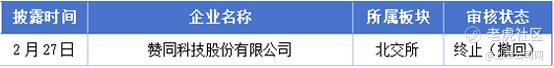 2月24日至3月1日期间,赞同科技股份有限公司终止(撤回)了IPO。