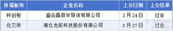 2月24日至3月1日期间,盛合晶微半导体有限公司、湖北龙辰科技股份有限公司成功通过了审核流程。