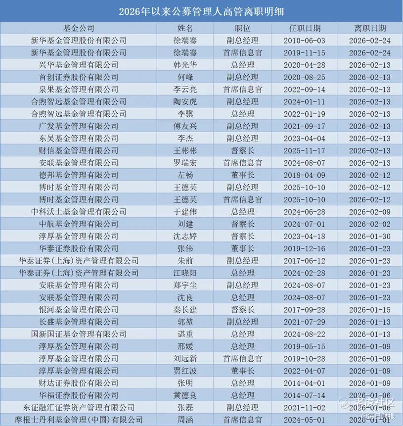 部分公募管理人有多位高管离任,如淳厚基金董事长贾红波、总经理邢媛、督察长沈志婷、首席信息官刘远新均在2026年1月份离任,背后是公司内部斗争严重;安联基金和合煦智远基金都有两位高管离任,均包含1名总经理。