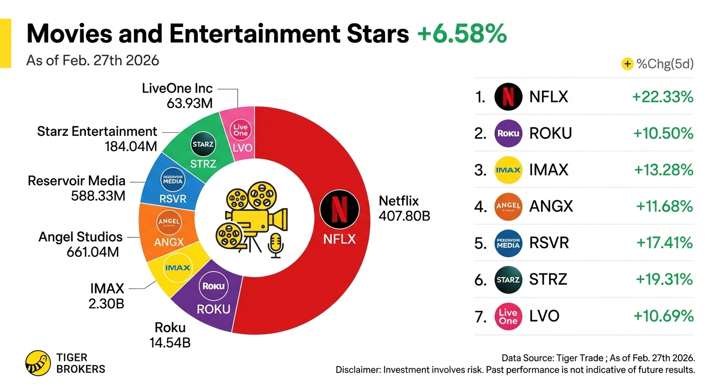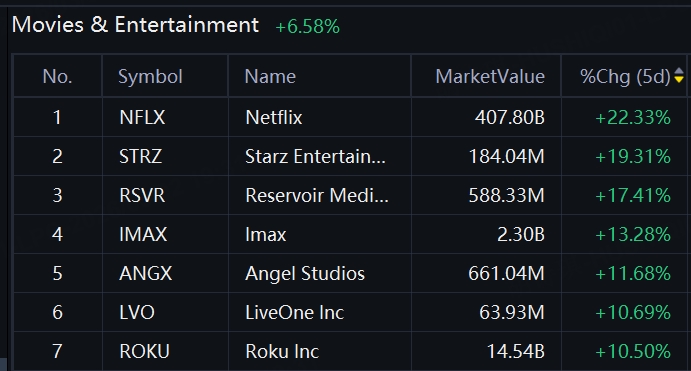 奈飞、Roku、IMAX带领娱乐板块上涨6.58%:情绪还是利润率结构性改善驱动?
