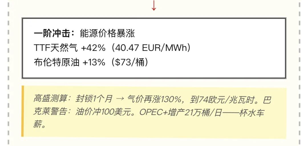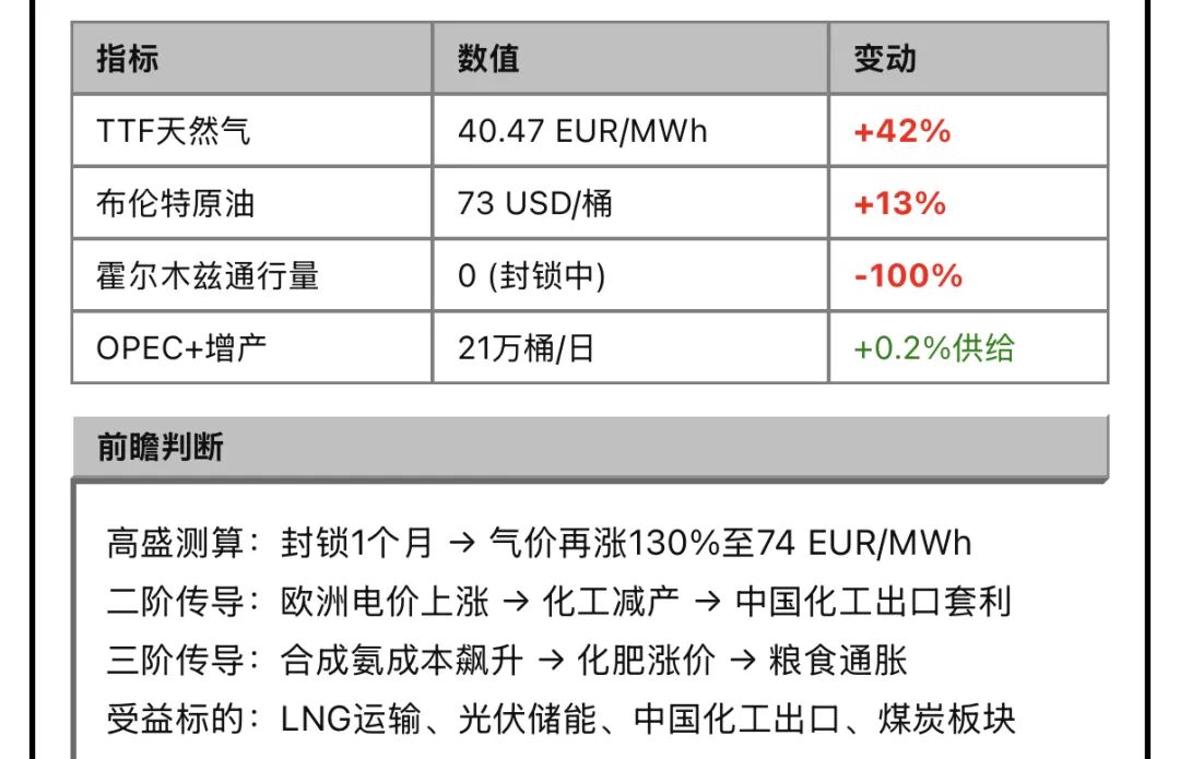 封锁消息落地后,TTF飙升至40.47欧元/兆瓦时,叠加OPEC+仅象征性增产21万桶/日,市场恐慌情绪迅速蔓延至整条能源链。高盛警告称,若封锁持续一个月,欧洲气价可能再涨130%,逼近2022年能源危机水平。