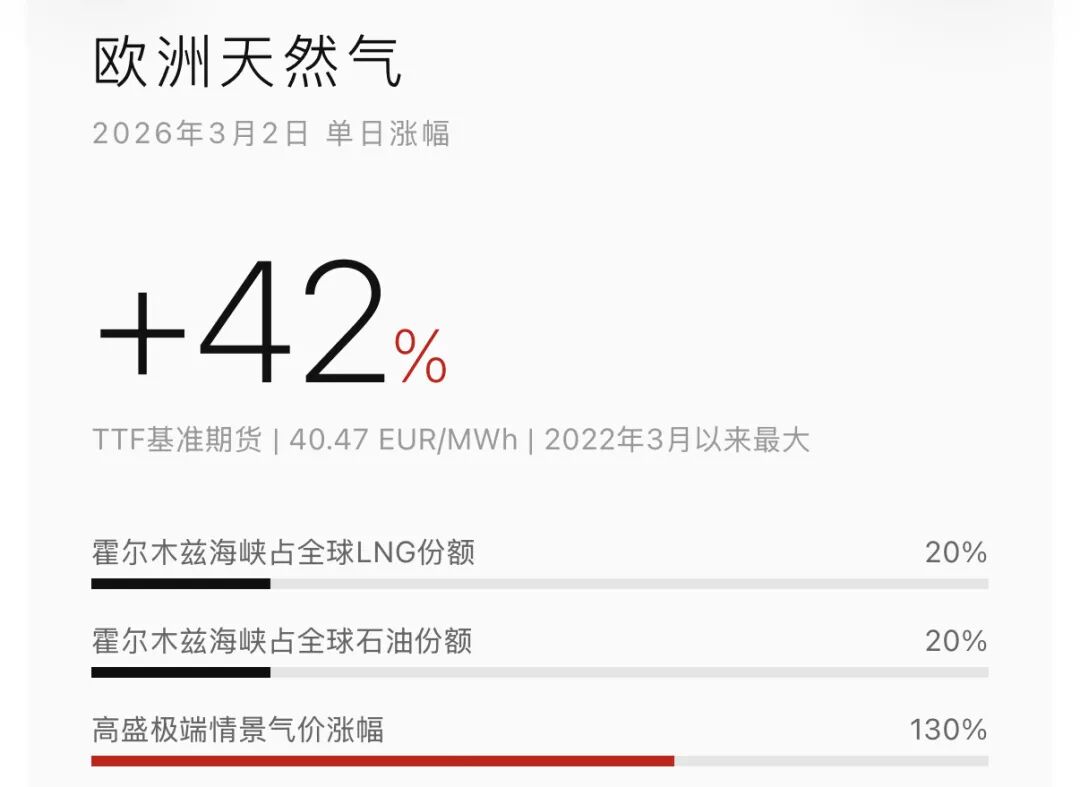 但真正值得盯紧的不是气价本身,而是它的二阶效应:欧洲电价必然跟涨,化工、玻璃、陶瓷等高耗能行业成本将被推高,而这恰恰意味着中国化工品对欧出口的套利窗口正在打开。
