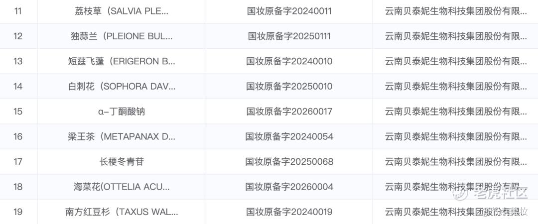 2025年前三季度,公司研发投入1.71亿元,费用率4.95%。更值得看的指标是“新原料备案”:截至目前,贝泰妮累计完成19项化妆品新原料备案,位居行业前列,从备案列表来看,都是云南本土成分——长梗冬青苷、总状绿绒蒿、滇牡丹籽油等。截至目前,在成果转化方面,已有7款新原料运用到旗下薇诺娜、瑷科缦、贝芙汀等品牌产品中,覆盖舒敏、保湿、抗衰等功效领域。