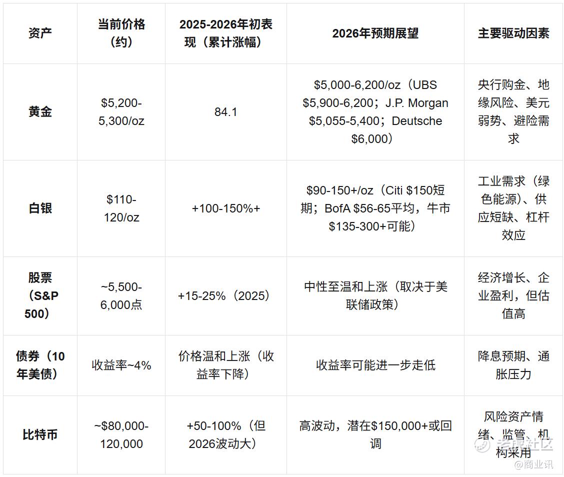 以下表格对比了黄金、白银与主流资产的近期表现和2026年展望(基于当前市场数据和机构共识,数据截至2026年1月底,表现为大致2025-2026年初累计回报或预期):