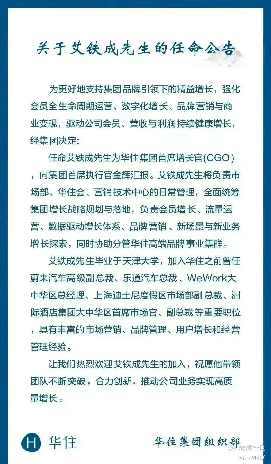 据凤凰网消息,3月3日,据博主“德卤爱开车”晒出的华住集团(HK1179)组织部任命公告,原乐道汽车总裁艾铁成加入华住集团,被任命为华住集团首席增长官(CGO),向集团首席执行官金辉汇报。