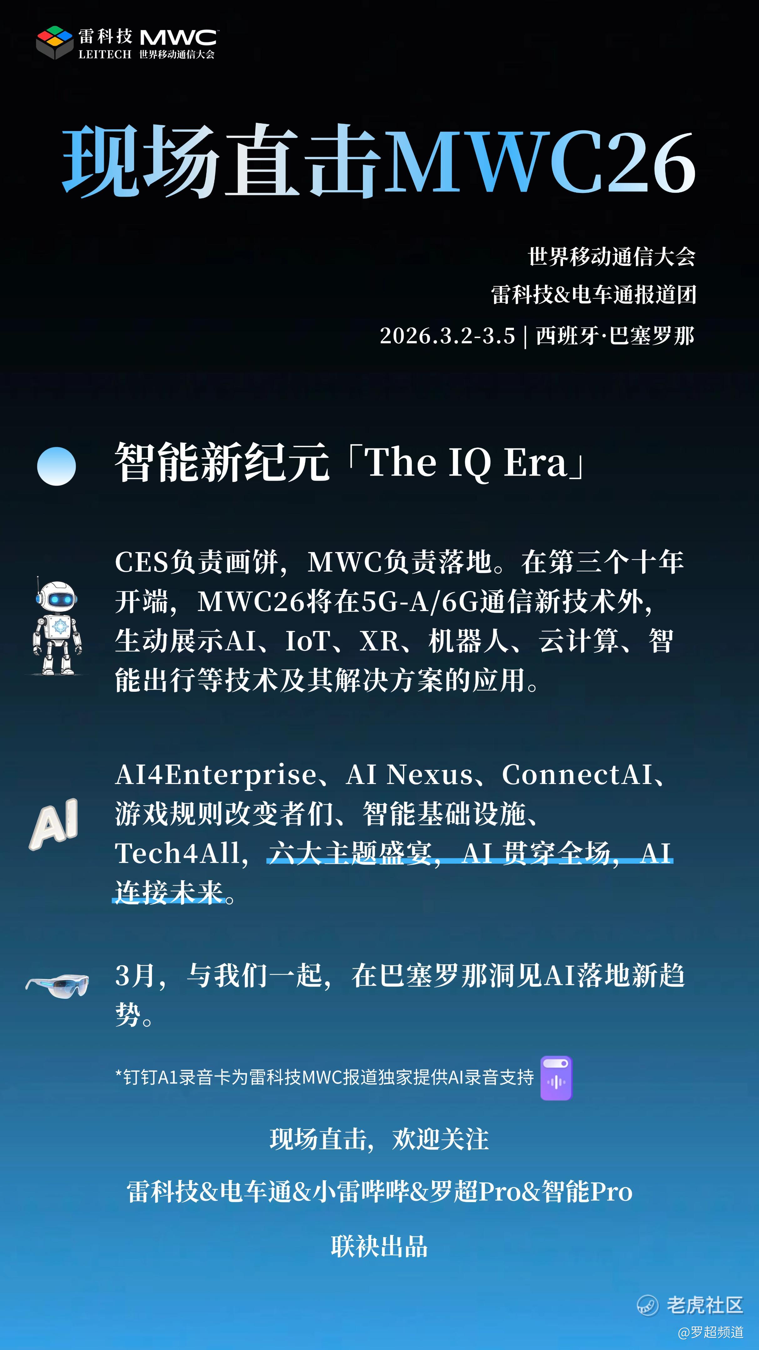 MWC(世界移动通信大会)26主题是智能新纪元「The IQ Era」,将在5G-A/6G通信新技术外,生动展示AI、IoT、XR、机器人、云计算、智能出行等技术及其解决方案的应用。
