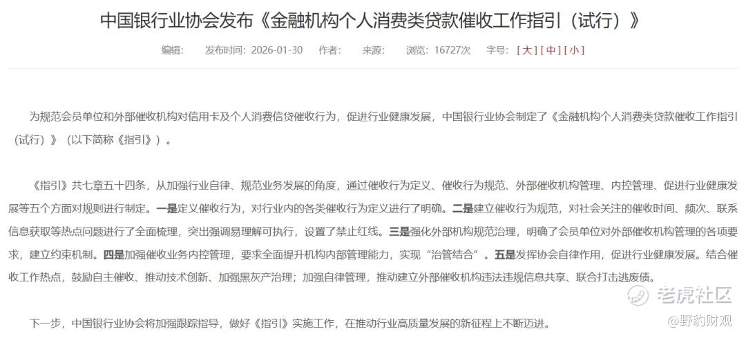 1月30日,中国银行业协会正式发布《金融机构个人消费类贷款催收工作指引(试行)》,从催收时间、话术规范、第三方联系边界,到金融机构对外包机构的主体责任,每一条规则都精准击中行业存续多年的催收顽疾,标志着消费金融行业全面进入强监管新周期。