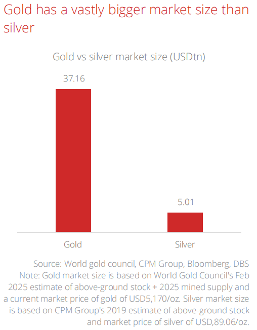 市场规模显著小于黄金(约5万亿美元 vs 36万亿美元)