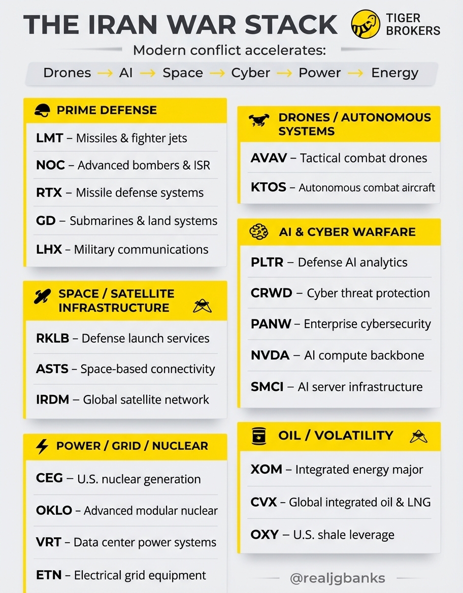 下面是一些你或许会感兴趣的股票: $洛克希德马丁(LMT)$ $诺斯罗普格鲁曼(NOC)$ $雷神技术公司(RTX)$ $通用动力(GD)$ $L3Harris Technologies Inc(LHX)$ $AeroVironment公司(AVAV)$ $克瑞拓斯安全防卫(KTOS)$ $Rocket Lab USA, Inc.(RKLB)$ $AST SpaceMobile, Inc.(ASTS)$ $铱星通讯(IRDM)$ $Palantir Technologies Inc.(PLTR)$ $CrowdStrike Holdings, Inc.(CRWD)$ $Palo Alto Networks(PANW)$ $英伟达(NVDA)$ $超微电脑(SMCI)$ $Constellation Energy Corp(CEG)$ $Oklo Inc.(OKLO)$ $Vertiv Holdings LLC(VRT)$ $伊顿(ETN)$ $埃克森美孚(XOM)$ $雪佛龙(CVX)$ $西方石油(OXY)$