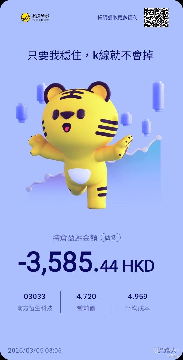 $南方恒生科技(03033)$ 无脑买。每大跌8%。我会再加。总会有机会升反既。合理价5.3左右。我计法系开括括上底加下底乘高除二。即52周最高同最低既中间位。